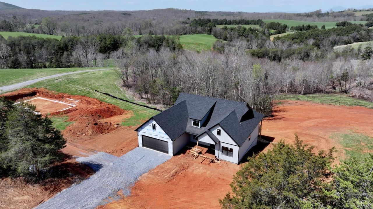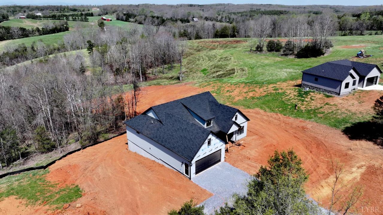 Stunning new construction modern farmhouse ranch on a 1.5-acre lot along Leesville Road in Evington, offering beautiful mountain views and a walk-out terrace level. Inviting rocking-chair front porch opens to a vaulted entry and spacious great room with vaulted ceilings and a floor-to-ceiling stone/shiplap electric fireplace. The chef's kitchen features custom shaker-style cabinetry, quartz countertops, a large center island, and access to a private deck. Spacious laundry room with abundant cabinetry and folding space. The primary suite offers a vaulted ceiling, large walk-in closet, and a spa-like bath with tiled walk-in shower, dual quartz vanity, and freestanding soaking tub. Two additional bedrooms share a full bath with double sink quartz countertops vanity. Unfinished walk-out terrace level provides excellent potential for future living space. Schedule your private showing today.